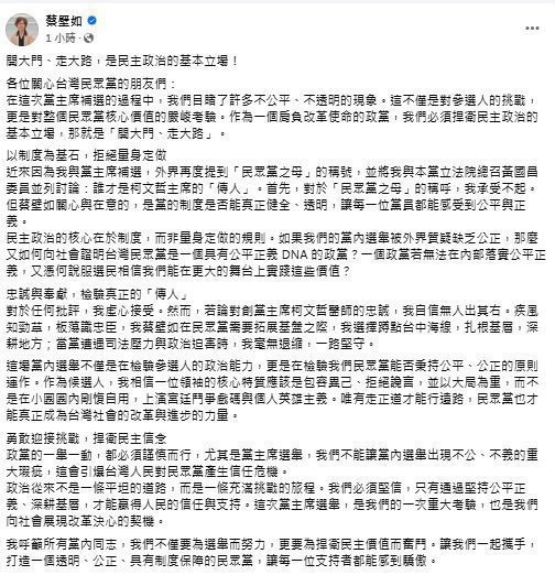 台灣民眾黨黨主席補選將在2月15日登場,由代理主席、立委黃國昌對上創黨元老、前立委蔡壁如。蔡壁如24日在臉書發文表示,黨主席補選的過程中有出現不公平、不透明的現象。她強調,一位領袖的核心特質應該是包容異己、拒絕讒言,並以大局為重,而不是在小圈圈內剛愎自用,上演宮廷鬥爭戲碼與個人英雄主義。她呼籲黨內同志一起攜手打造一個具有制度保障的民眾黨,讓每一位支持者都能感到驕傲。 民眾黨22日上午9時展開參選人線上連署,兩人都已達300人連署門檻。23日黃國昌已拿下6632餘票,遠超過蔡壁如358票,預計在2月8日和2月14日舉辦兩場政見發表會。 蔡壁如表示,在這次黨主席補選的過程中,目睹了許多不公平、不透明的現象。這不僅是對參選人的挑戰,更是對整個民眾黨核心價值的嚴峻考驗。作為一個肩負改革使命的政黨,必須捍衛民主政治的基本立場,那就是“開大門、走大路”。 蔡壁如提及,近來因為她參與黨主席補選,外界再度提到“民眾黨之母”的稱號,並將她與民眾黨立法院黨團總召黃國昌並列討論:誰才是柯文哲主席的“傳人”。首先,對於“民眾黨之母”的稱呼,蔡說她承受不起。但她關心與在意的,是黨的制度是否能真正健全、透明,讓每一位黨員都能感受到公平與正義。 蔡壁如強調,民主政治的核心在於制度,而非量身定做的規則。如果民眾黨內選舉被外界質疑缺乏公正,那麼又如何向社會證明台灣民眾黨是一個具有公平正義DNA的政黨?一個政黨若無法在內部落實公平正義,又憑何說服選民相信民眾黨能在更大的舞台上實踐這些價值? ![]() 蔡壁如說道,對於任何批評,她虛心接受。然而,若論對創黨主席柯文哲的忠誠,她自信無人出其右。疾風知勁草,板蕩識忠臣。她在民眾黨需要拓展基盤之際,她選擇蹲點台中海線,扎根基層,深耕地方;當黨遭遇司法壓力與政治迫害時,她毫無退縮,一路堅守。 蔡壁如指出,這場黨內選舉不僅是在檢驗參選人的政治能力,更是在檢驗民眾黨能否秉持公平、公正的原則運作。作為候選人,她相信一位領袖的核心特質應該是包容異己、拒絕讒言,並以大局為重。而不是在小圈圈內剛愎自用,上演宮廷鬥爭戲碼與個人英雄主義。唯有走正道才能行遠路,民眾黨才能真正成為台灣社會改革與進步的力量。 蔡壁如認為,政黨的一舉一動,都必須謹慎而行。尤其是黨主席選舉,不能讓黨內選舉出現不公、不義的重大瑕疵,這會引爆台灣人民對民眾黨產生信任危機。政治從來不是一條平坦的道路,而是一條充滿挑戰的旅程。衹有通過堅持公平正義、深耕基層,才能贏得人民的信任與支持。這次黨主席選舉,是民眾黨的一次重大考驗,也是民眾黨向社會展現改革決心的契機。 蔡壁如呼籲所有黨內同志,不僅要為選舉而努力,更要為捍衛民主價值而奮鬥。一起攜手打造一個透明、公正、具有制度保障的民眾黨,讓每一位支持者都能感到驕傲。 |