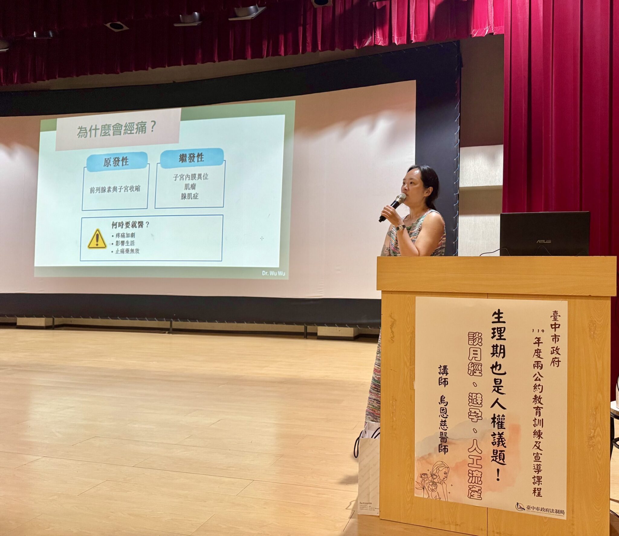 台中市政府今(4)日上午舉辦兩公約教育訓練及宣導課程,以「生理期也是人權議題!談月經、避孕、人工流產」為主題,邀請禾馨婦產科診所主治醫師烏恩慈擔任講師,從專業醫療角度出發,帶領學員探討婦女健康權與人權保障的連結。法制局表示,課程的目的是希望人權能與市民切身需求及日常生活緊密連結。盼透過今日的學習,協助同仁跳脫刻板印象,並在未來行政工作中,持續推動性別平等與人權保障。