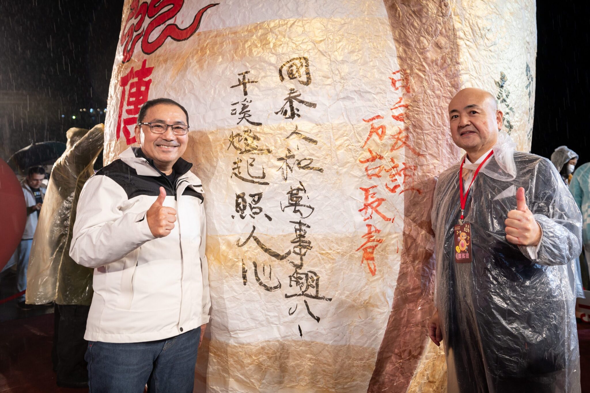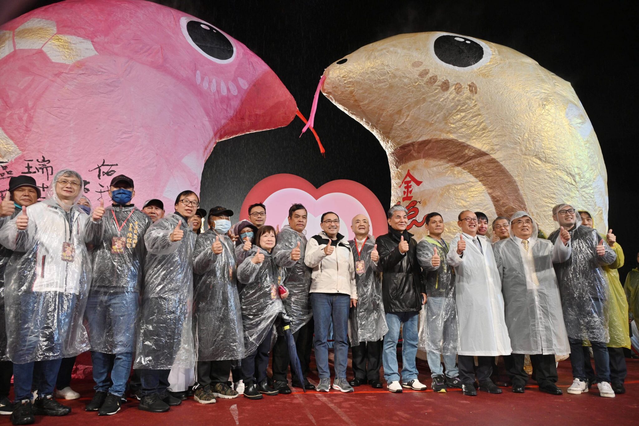 「2025新北市平溪天燈節」今(12)日在十分廣場迎來第二場天燈施放活動。市長侯友宜偕同國際貴賓一同施放蛇年雙心主燈,並在主燈上題字「平溪燈起照人心 國泰人和萬事興」,祈願新的一年國人面對各項挑戰都能同心齊力萬事興。