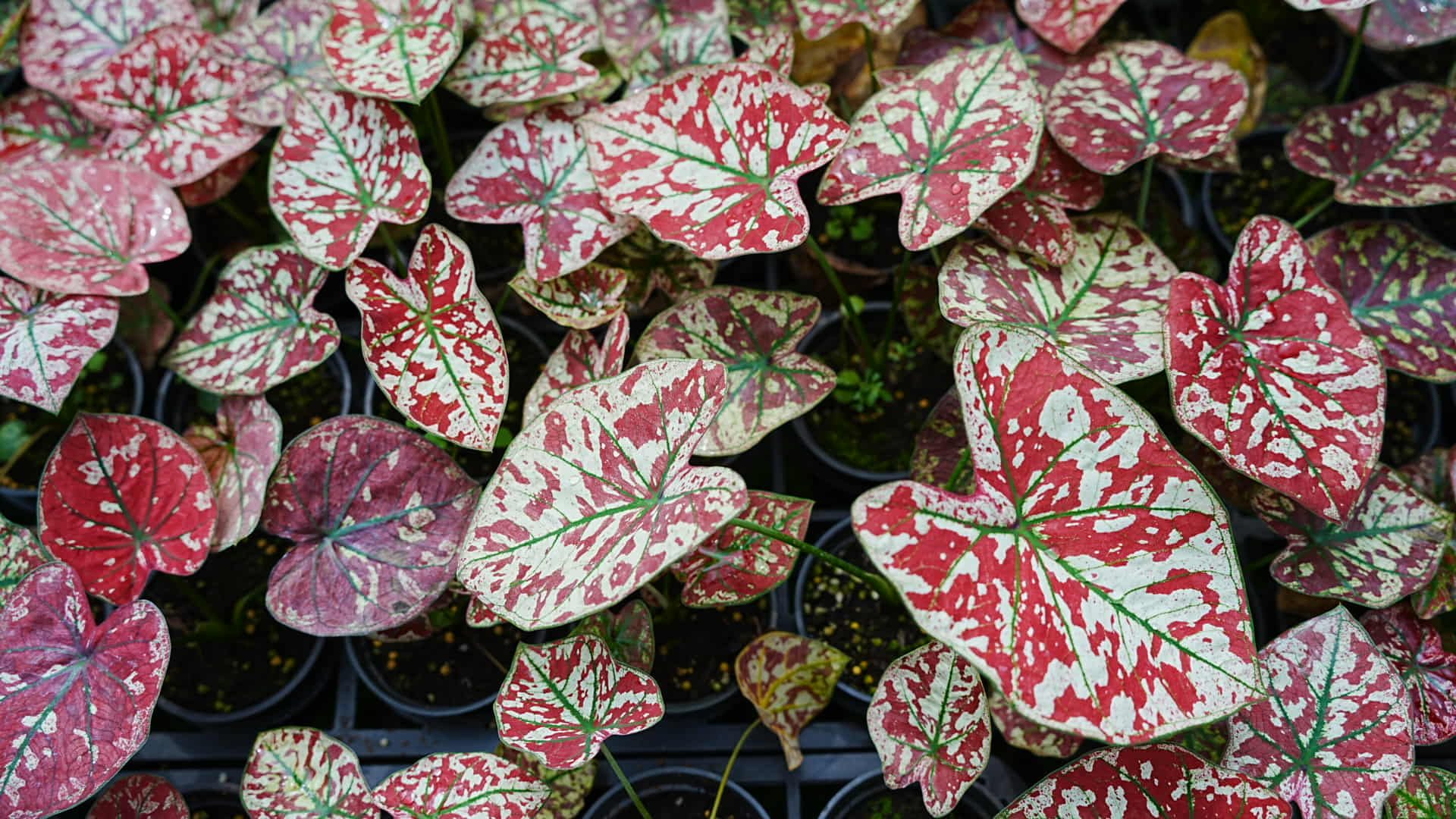 除了主角朱槿,今年還特別增設「彩葉芋特展區」,展出「宇宙唯一」、「朝霞」等近十種色彩繽紛、紋理細膩的彩葉芋。彩葉芋的斑斕葉色與朱槿的艷麗花姿交織出一座熱帶花園的絢爛風景,為展覽增添夢幻層次。