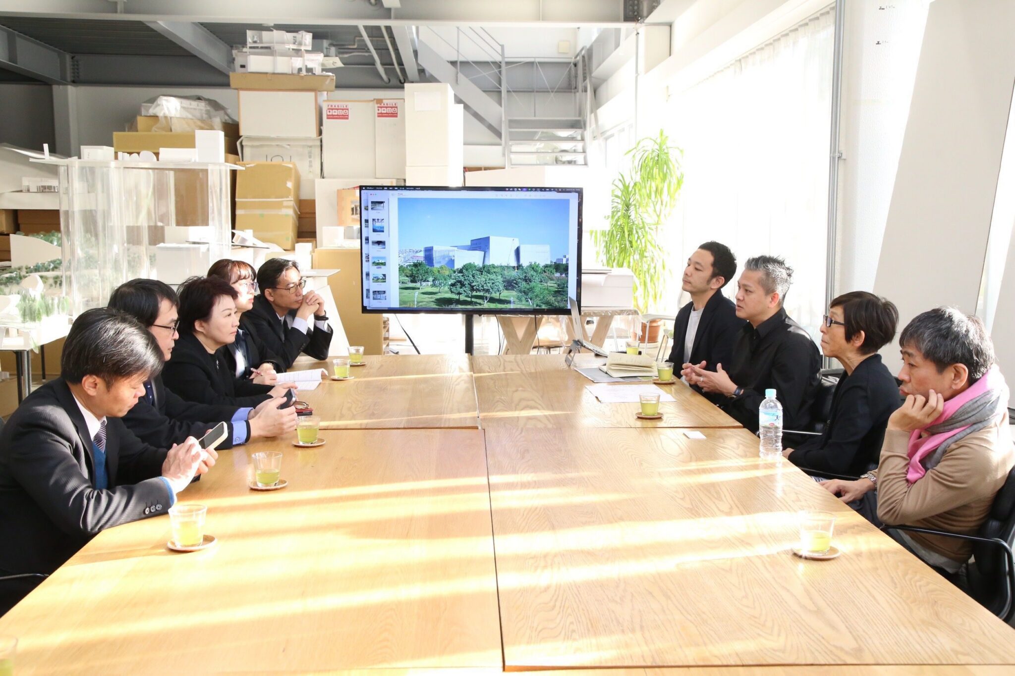 為迎接台中綠美圖開館,盧市長下午前往日本知名建築設計事務所SANAA,與妹島和世、西澤立衛及福原光太等建築師會面,針對綠美圖開館前的相關細節進行討論。