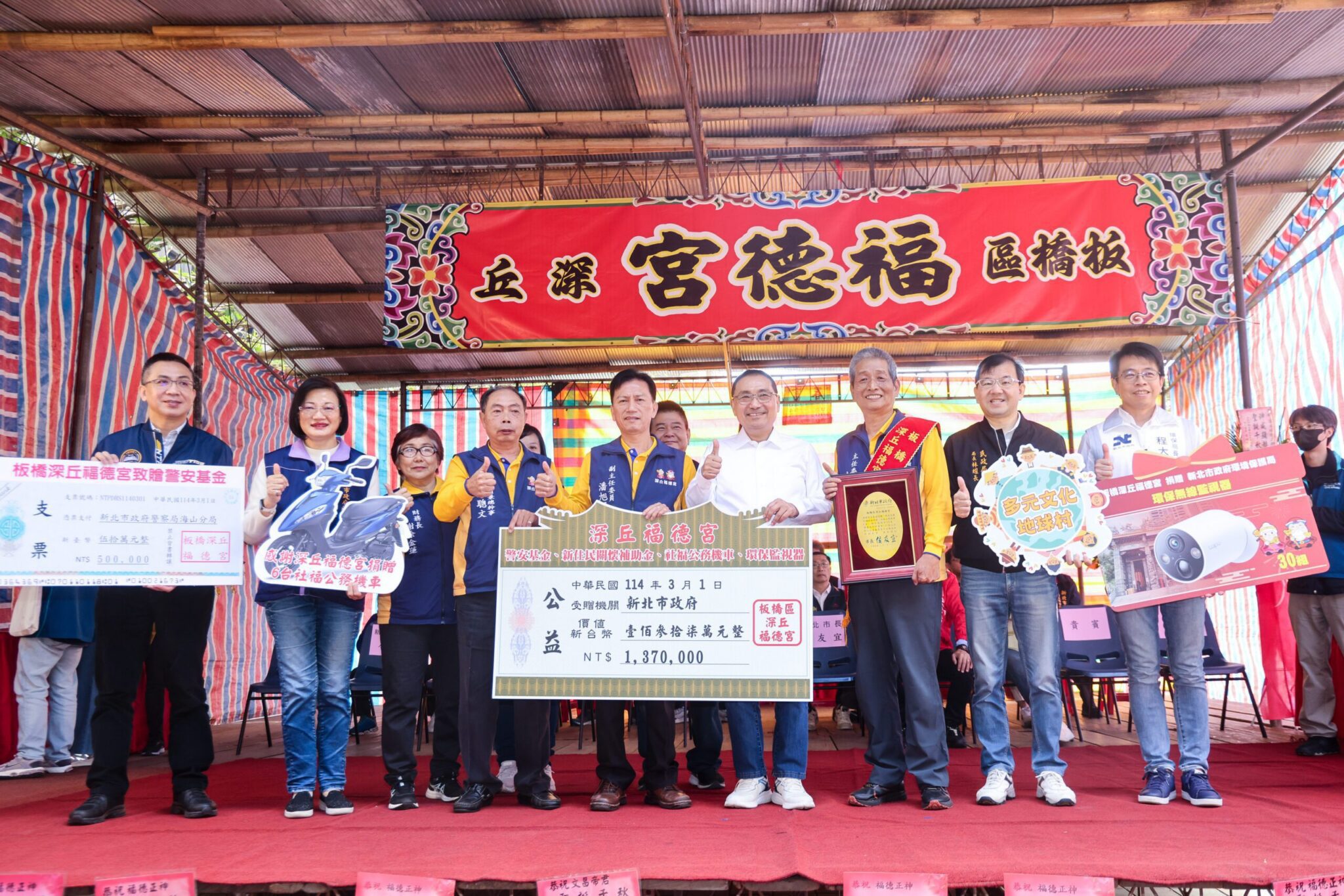 侯友宜表示,深丘福德宮長年投入公益,提供清寒學生獎學金、捐贈消防車、復康巴士,尤其新冠疫情期間出錢出力,充分發揚土地公慈悲精神。這次在福德正神聖誕千秋再次發揮善心,不僅捐贈警安基金、新住民關懷計畫基金,還捐助社福公務機車、環保監視器,讓市府有更多資源來服務照顧市民。