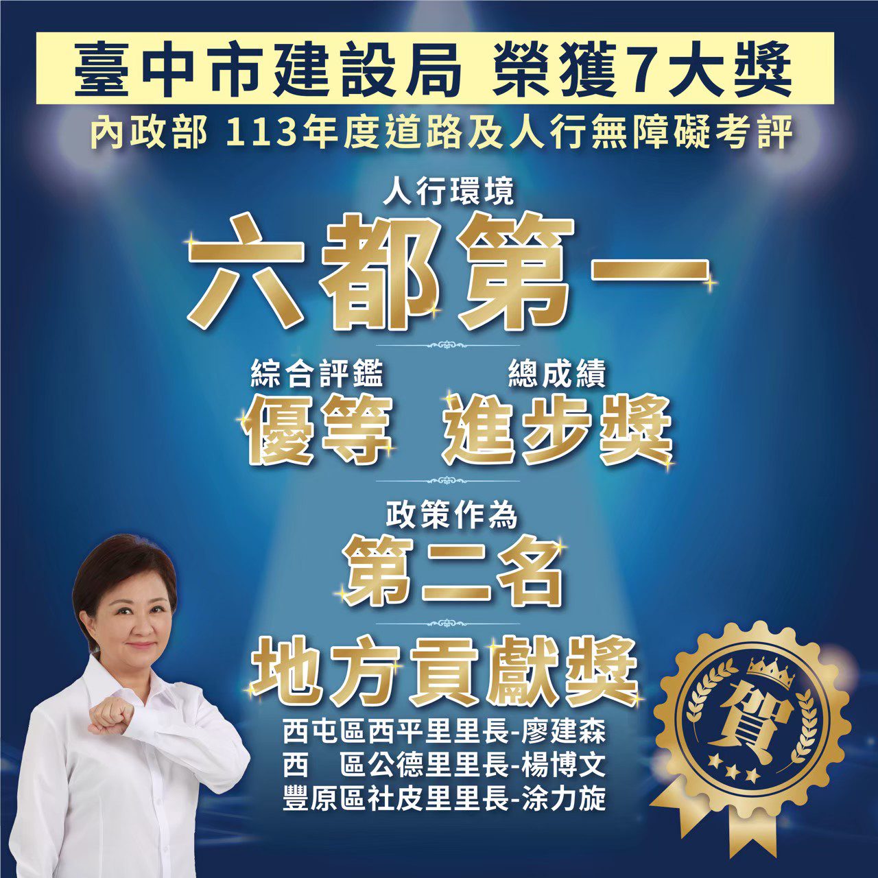 在人本街道打造方面,建設局秉持盧市長「行人優先」的理念持續優化人行環境,自108年起,人行道新建及改善已完成545處,長度達191公里,並完成134所學校通學步道改善,總長38.8公里;同時,道路燙平專案亦同步推進,截至114年11月已完成超過4,086條主次道路、鄰里巷道,累積長度達1,042公里;透過道路優化、公設整併、人行道拓寬與修繕等多重措施,實質大幅提升市民步行與用路安全。優異的成果在內政部國土署「113 年市區道路養護管理暨人行環境無障礙評鑑」,台中市獲頒直轄市組第一名殊榮,成為行人優先的典範城市。