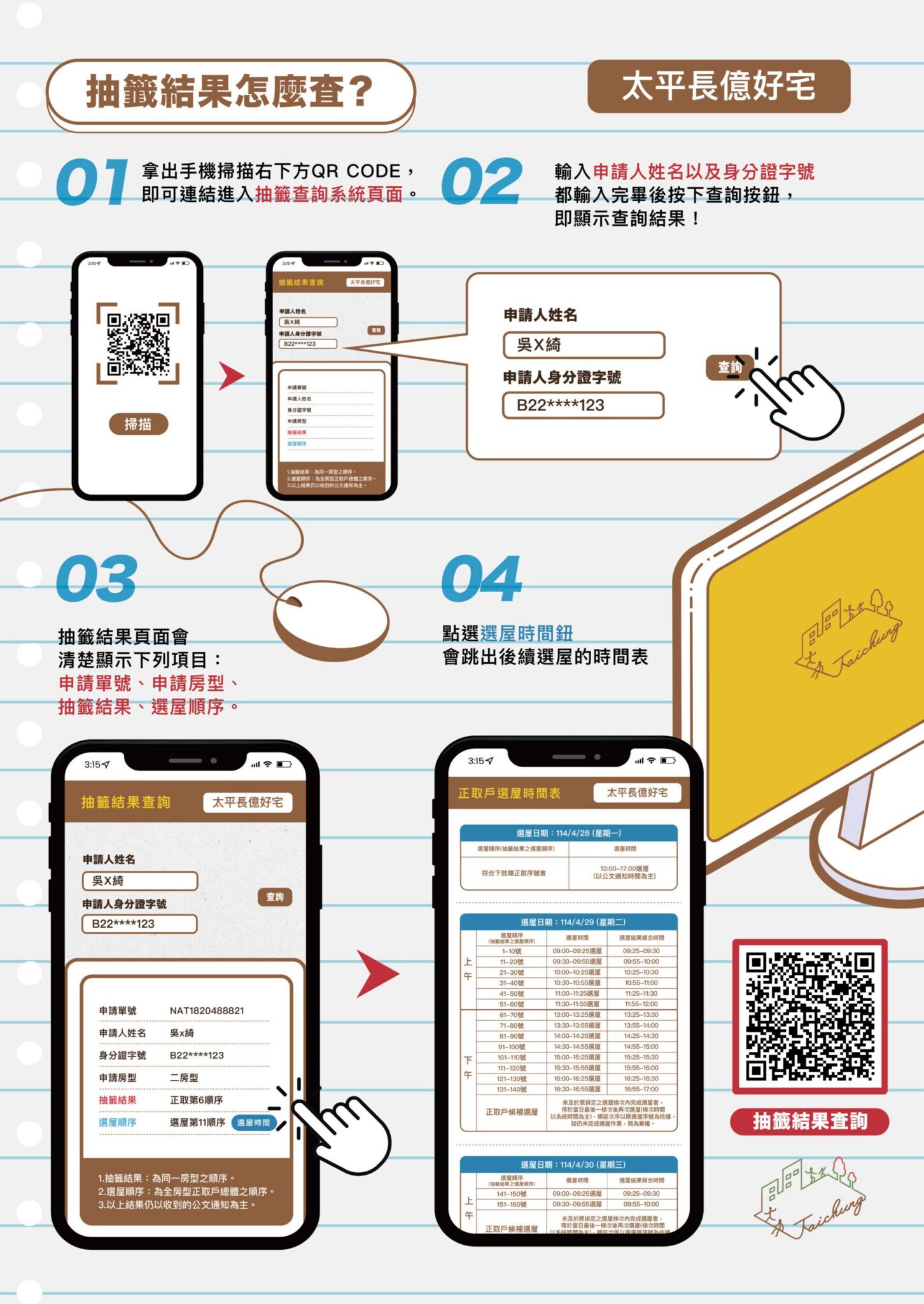 住宅處說明,今日抽籤結果於現場同步列印並公布於住宅處官方網站上,歡迎民眾可上網檢視,住宅處將陸續寄發公文通知正取戶後續作業期程,預計4-5月辦理現場看屋及線上選屋作業,6月辦理簽約作業後即可入住,因此,申請人如搬遷或特殊因素無法收受掛號信件,請儘速向住宅處申請變更通訊地址,以免自身權益受損。如有相關問題,可電洽住宅處(住宅服務科),電話04-22289111轉69300。