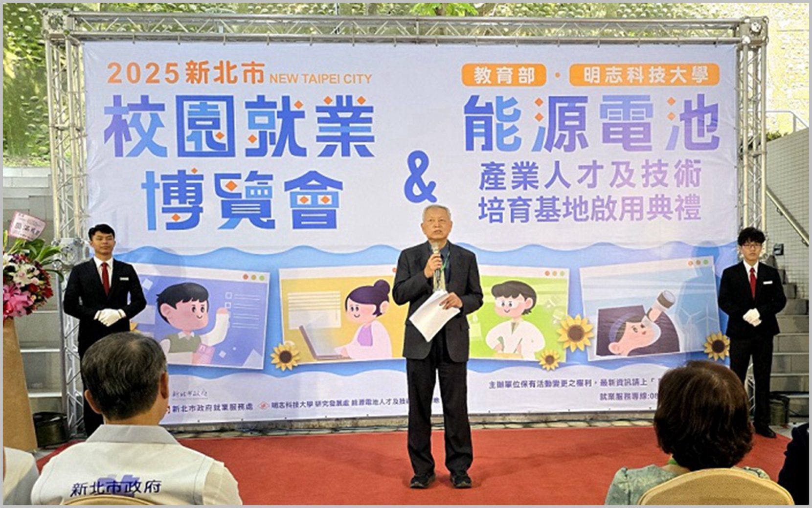 這次的基地啟用典禮受到學術界與產業界的高度重視,並促成產官學研齊聚一堂,政府首長有教育部技職司楊玉惠司長、勞工局陳瑞嘉局長、就業服務處葉建能處長、勞動部蔡坤炎場長等;產業單位有工業總會呂正華祕書長、電池協會陳勝光理事長、SGS陳雅枝副總裁、新智能科技劉慧啟總經理、格斯科技張忠傑董事長、有量科技李誌誠總經理、興能高科技謝祥豪總經理、輝能科技呂理欽副總經理、能元科技謝馥宇廠長等;學研機構除了明志科大劉祖華校長之外,該校董事會亦有李玉庭董事出席,另有台灣科技大學顏家鈺校長、聯合大學侯帝光校長、龍華科大陳逸謙副校長、長庚大學郭斯彥院長、化工學會黃炳照理事長、材料學會陳信文理事長、碳材學會劉偉仁理事長、電化學學會王復民常務理事等也聯袂出席,共同見證基地啟用的歷史性時刻。此基地將成為產官學研在人員培訓及實務技術創新等方面的合作平台,協助產業培育人才,提升員工專業素質及產業競爭力。