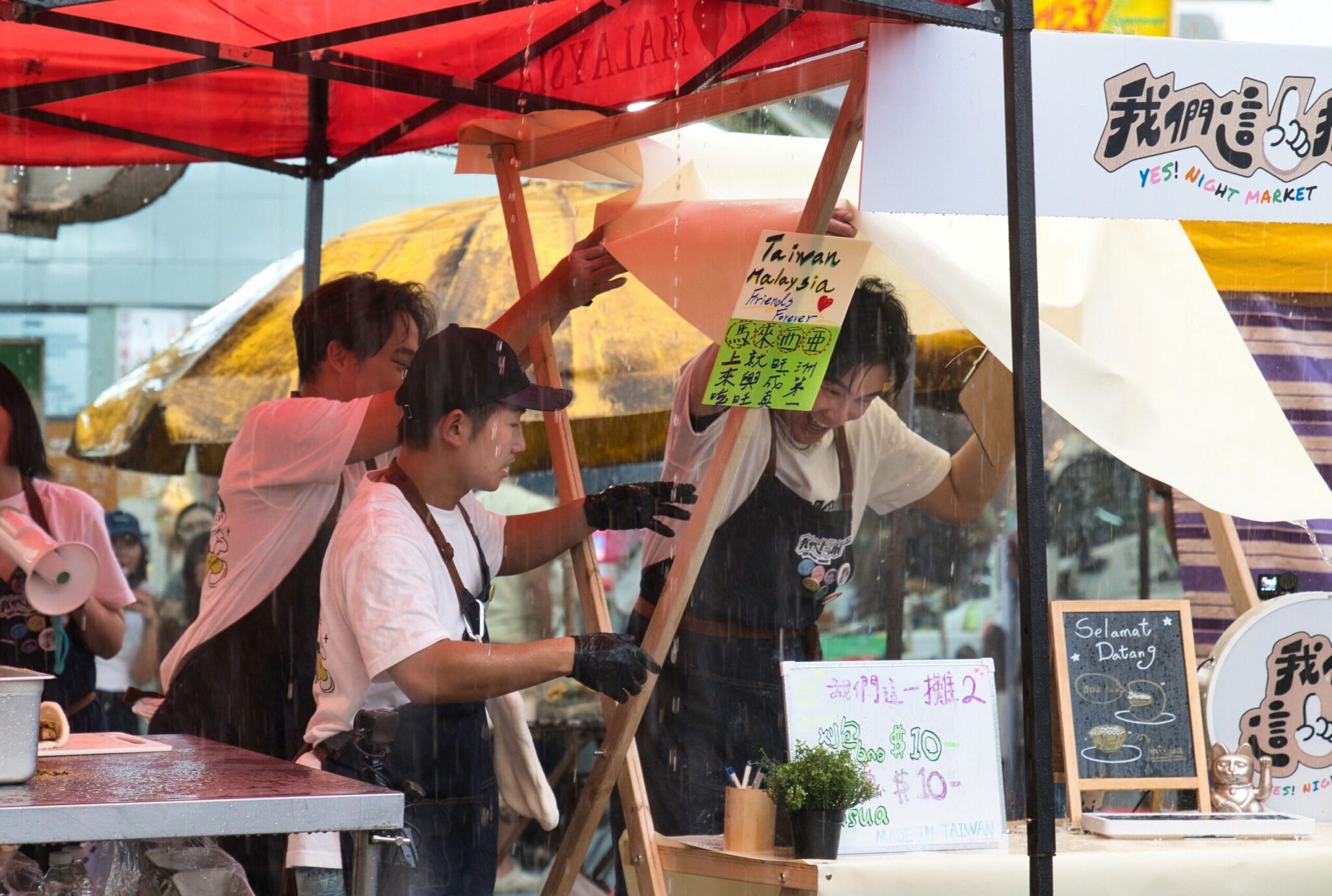 然而擺攤之路並不總是順遂。正當大家備妥食材準備開賣時,天公不作美,夜市現場棚頂突然漏水,導致食材面臨雨淋危機,謝佳見在帳棚下首當其衝被淋,場面一度混亂。藝人們緊急應對、全員上陣護食材,也展現出團隊默契與臨場反應。值得一提的是,儘管當地年輕人不如台灣民眾熱衷於逛夜市,但明星團隊的出現仍引來不少民眾圍觀與排隊,甚至有人好奇問:「你們是藝人嗎?」蔡昌憲則自信回應:「我們在台灣賣東西,是排到看不到盡頭的喔!」不僅引來現場笑聲,也成功拉近彼此距離。