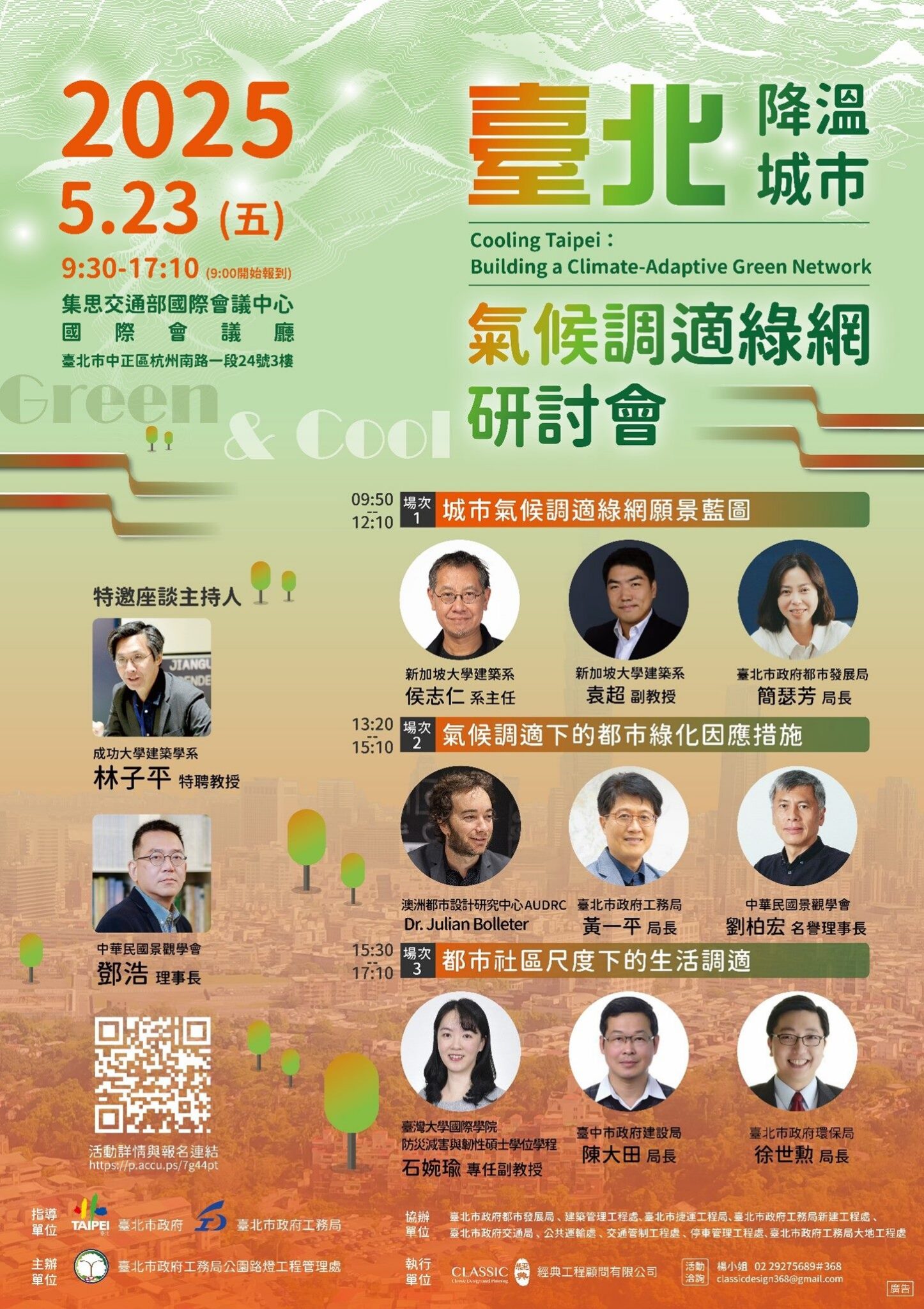 臺北降溫城市氣候調適綠網研討會」上,來自新加坡、澳洲及臺灣的多位專家學者齊聚一堂,討論全球及本地在氣候變遷下的都市降溫與綠化策略。此次特別邀請到國外學者,包含新加坡大學建築系系主任侯志仁教授,介紹西雅圖推動都市降溫與樹蔭覆蓋率方面的努力;致力於城市風環境與綠化降溫效益研究的新加坡大學建築系袁超副教授,則分享城市熱問題的見解與解決方案;西澳大學澳洲都市設計研究中心 Dr. Julian Bolleter 目前正指導西澳的氣候適應計畫,其研究主要針對未來氣候情境提出創新的都市設計手法。國內專家學者則由臺灣大學石婉瑜專任副教授,分享如何推動社區型綠地減緩極端氣候對脆弱群體的衝擊。