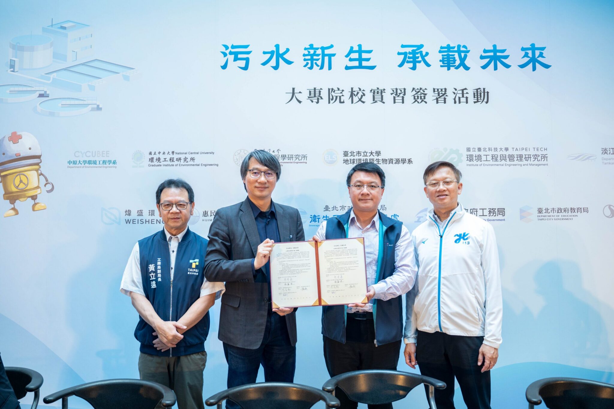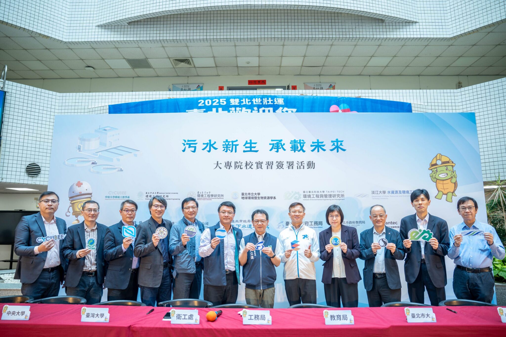 臺北市政府衛生下水道工程處今(26)日舉行「污水新生 承載未來」大專院校實習簽署典禮,工務局副局長黃立遠、教育局副局長鄧進權及國內6所大學蒞臨見證。